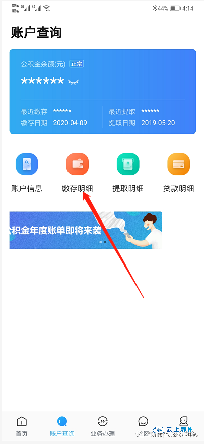 1.打开手机公积金APP,登录后,进入【账户查询】页面,点击缴存明细。