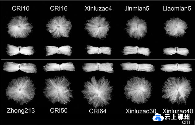 ▲早熟棉的早期品种(上排)和当代品种(下排)的纤维长度比较