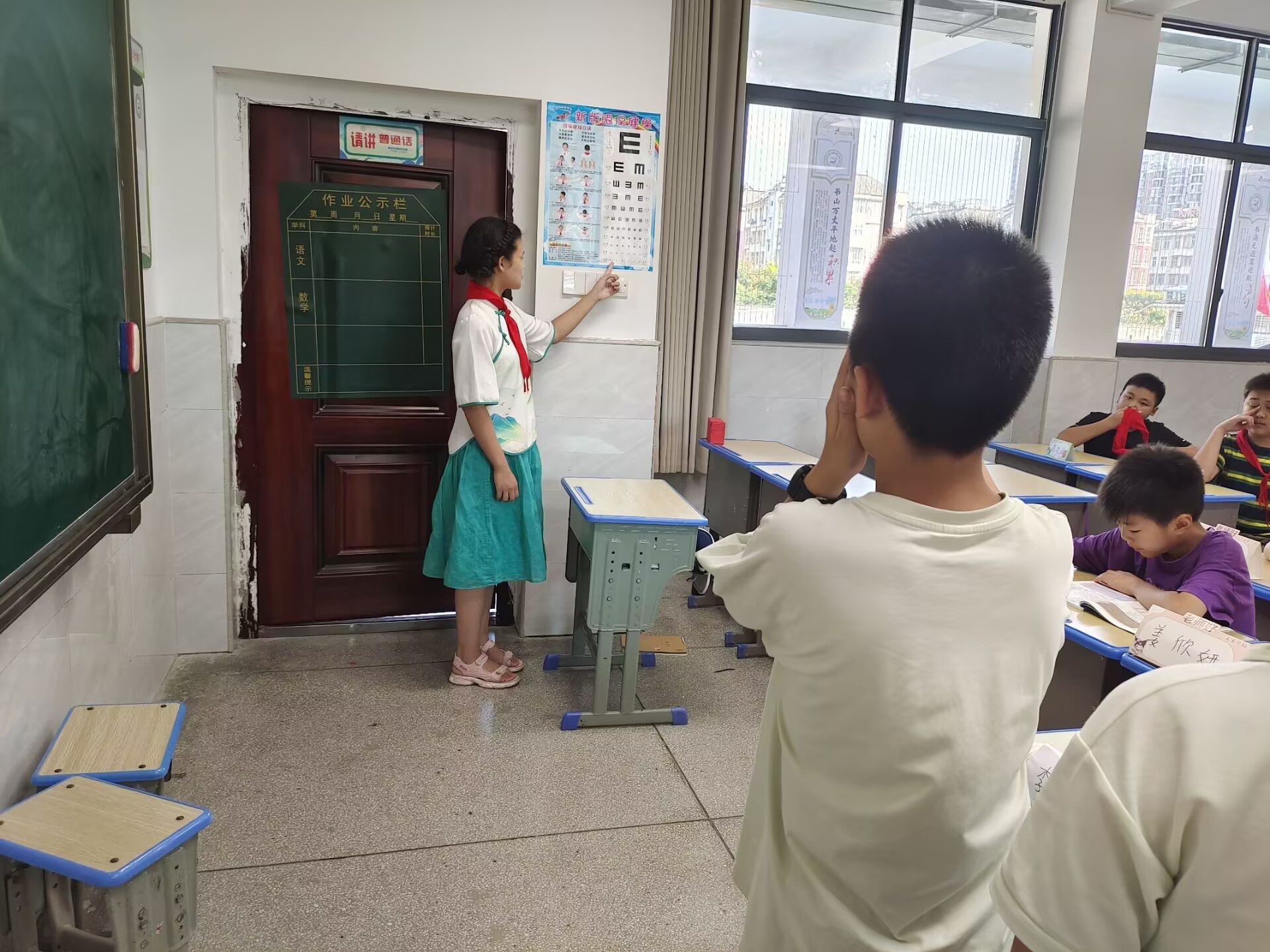 日常防控与动态监测同步推进。学校建立“每月班级近视自查”机制,9至11月每月组织1次检测:由班主任或卫生委员使用标准对数视力表为学生测视力,同步观察读写姿势、眼保健操完成情况,填写《班级用眼习惯自查表》;各班为学生建立“视力健康档案”,重点跟踪视力下降、姿势不规范的学生,并将自查结果反馈至家长群,打通家校共育环节。此外,学校严格落实每日上下午各1次眼保健操,班主任全程监督确保穴位准确;通过大课间、体育课、课后兴趣班等渠道,保障学生每天1小时户外活动,同时每月检查教室采光、课桌椅高度,营造符合卫生标准的用眼环境。