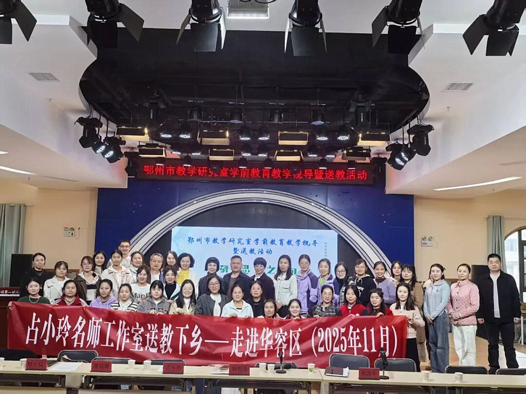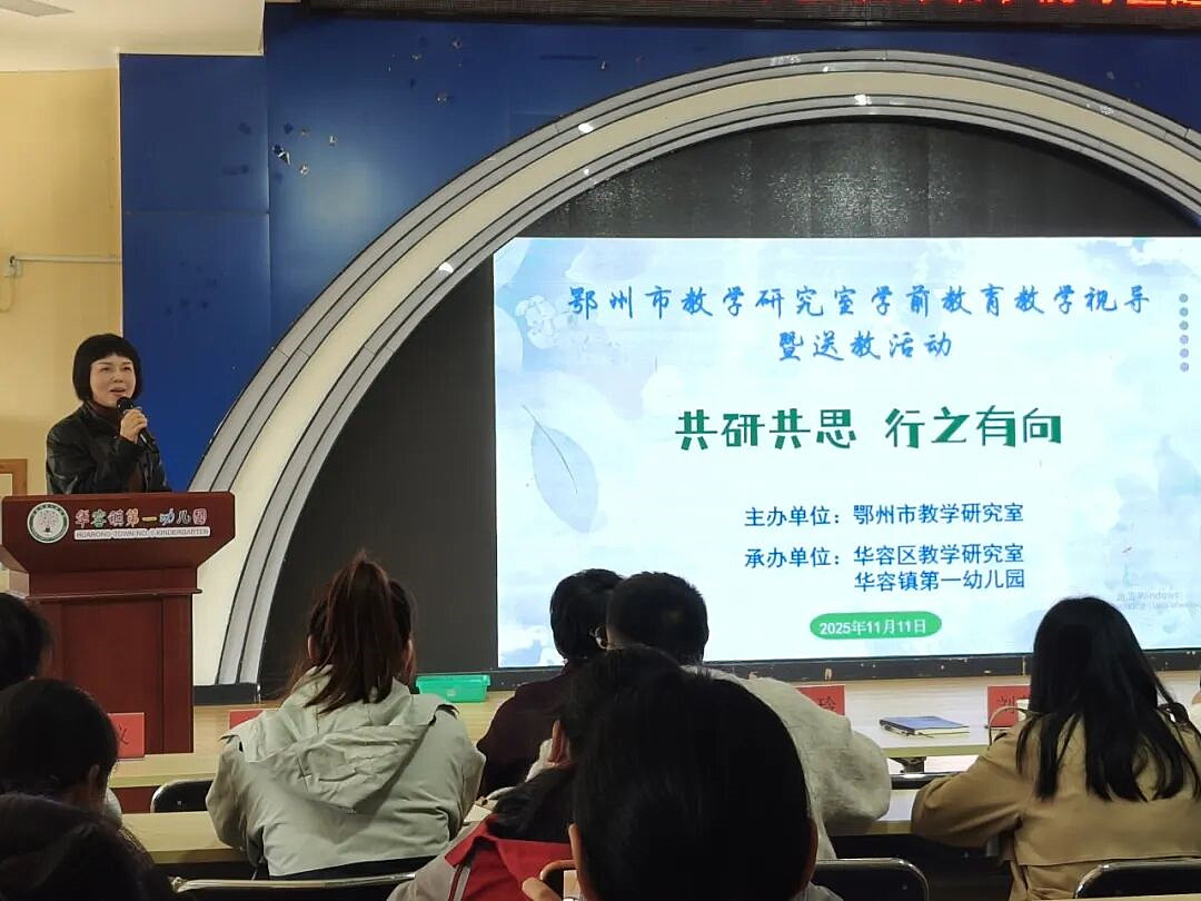 秋韵漫华容,教研暖乡园。11月7日,由市教育局教研室主办的市级教学视导暨送教下乡活动在华容区顺利举行。鄂州市占小玲名师工作室团队受邀参加活动并承担送教指导。本次活动通过示范课展示、沉浸式教研、圆桌座谈等多元形式,为华容区幼儿园50余名园长、骨干教师搭建学习交流与能力提升的优质平台。 活动开始前,市教研室学前教育教研员、市督学刘菊莲及工作室专家团队深入华容一幼,对园所环境进行了细致的巡视指导,提出了兼具专业性与实操性的优化建议。