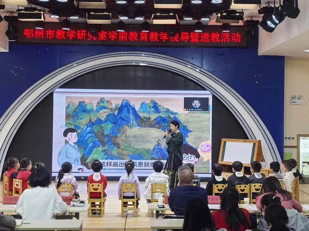 教学观摩中,占小玲名师工作室成员冯若老师执教的大班音乐律动《武林大会》,以刚柔并济的节奏和充满童趣的情境,让孩子们在律动中感受中华武术的独特魅力;赵子仪老师带来的《梁子湖山水图》,则引导幼儿用水墨点染家乡美景,结合AI技术,达成“以传统笔墨,绘家乡新韵”的美育目标。两节艺术活动如清泉流淌,为华容区的幼儿园教师提供了多维度的艺术活动教学启发。