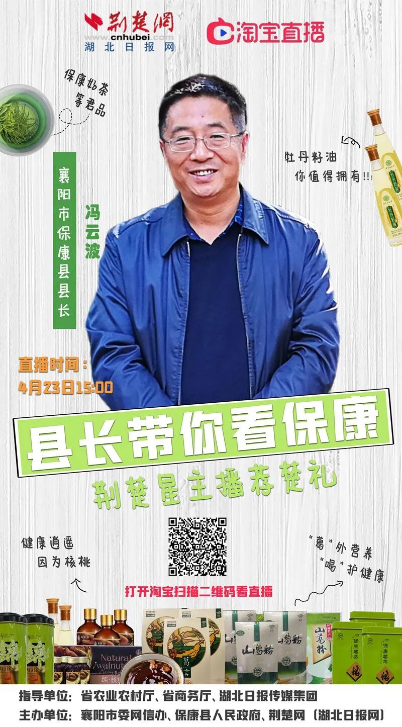 届时,襄阳市保康县县长将化身“带货主播”,携手荆楚星主播向网友们推介来自保康的“大山珍宝”,将最优质的产品,以最优惠的价格推荐给大家。