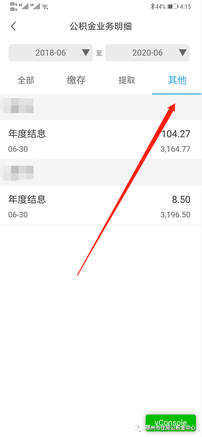2.进入【公积金业务明细】页面,选择其他,就可以查询到年终结息的信息了。