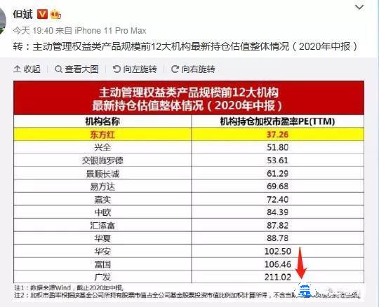 数据显示,截至2020年中报,主动权益类基金规模最大的12家基金公司中,持仓估值最低为东方红、兴全基金,持仓股票的加权市盈率为37.26倍、51.80倍。持仓估值最高的是富国基金、广发基金,持仓股票的加权市盈率为106.46倍、211.02倍。上述持仓估值高低相差最高达6倍。