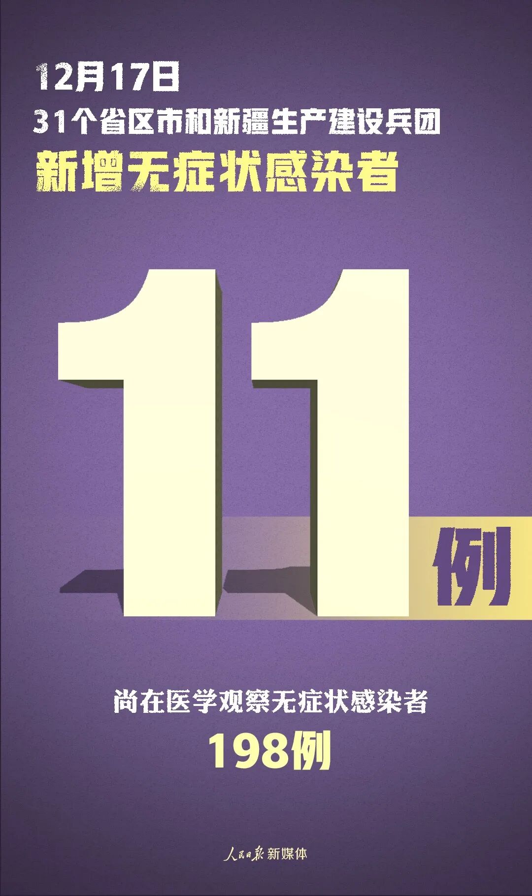 12月17日0—24时,31个省(自治区、直辖市)和新疆生产建设兵团报告新增确诊病例12例,其中境外输入病例11例(上海4例,广东4例,山西1例,河南1例,云南1例),本土病例1例(在四川);无新增死亡病例;无新增疑似病例。