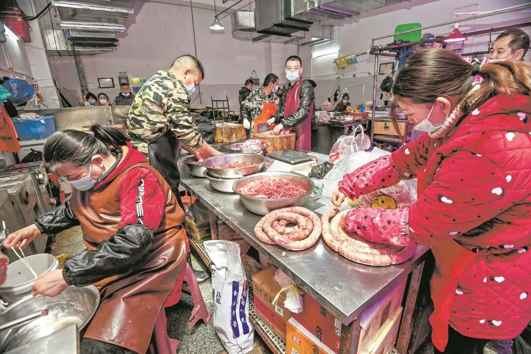 记者在现场看到,尽管刚接近中午,已经叫到了302号。摊主说,市民既可以在店里买肉制作,也可以自己带肉来灌肠,一般是白天排队下单,最早晚上拿腊肠,从12月初开始天天加班,旺季比往年提前了至少半个月。
