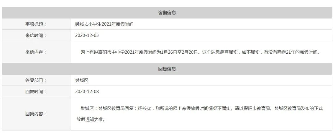 有市民咨询:网上有说襄阳市中小学2021年寒假时间为1月26日至2月20日。请问这个消息是否属实?