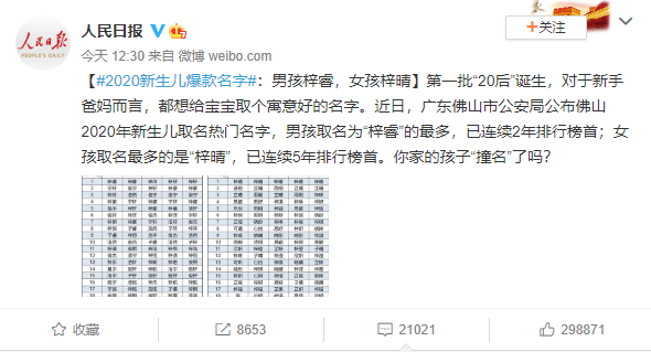 据广东省佛山市公安局公布的“2020新生儿爆款名字”,“梓x”组合领衔上榜。