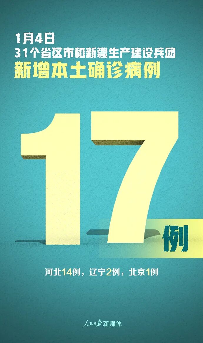 1月4日0—24时,31个省(自治区、直辖市)和新疆生产建设兵团报告新增确诊病例33例,其中境外输入病例16例(上海6例,广东4例,天津1例,辽宁1例,江苏1例,福建1例,河南1例,四川1例),本土病例17例(河北14例,辽宁2例,北京1例);无新增死亡病例;无新增疑似病例。