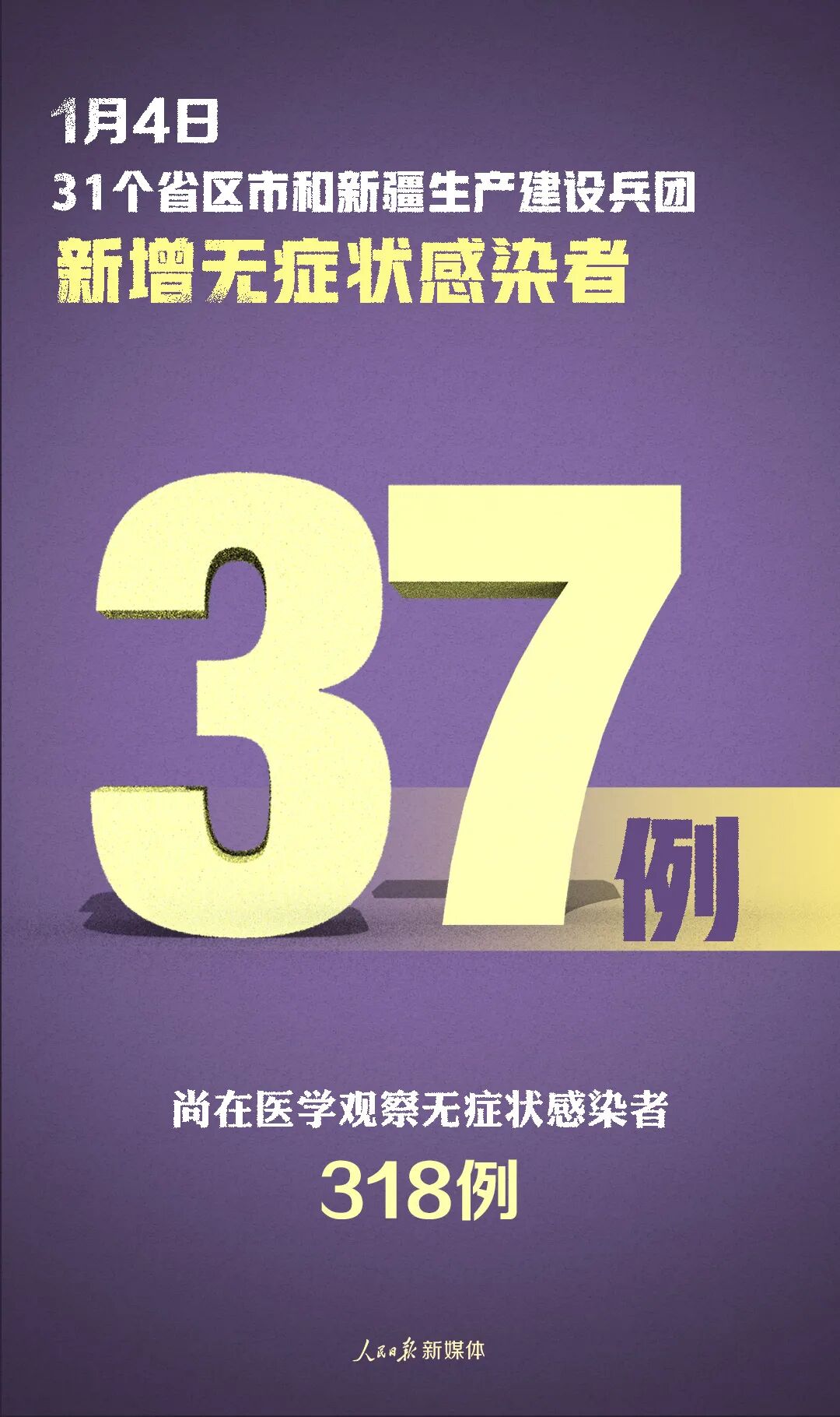 31个省(自治区、直辖市)和新疆生产建设兵团报告新增无症状感染者37例(境外输入6例);当日转为确诊病例5例(境外输入2例);当日解除医学观察8例(境外输入4例);尚在医学观察无症状感染者318例(境外输入240例)。