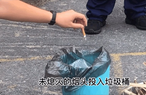 阿消用实验来证明未熄灭的烟头到底有多危险烟头丢入垃圾桶:不到一分钟就阴燃实验中,消防员将未熄灭的烟头投入装有纸巾、塑料片等可燃物的垃圾桶后,烟头接触位置的塑料片立刻开始熔化,纸巾开始冒烟。不到1分钟,垃圾桶内就出现了阴燃的情况。