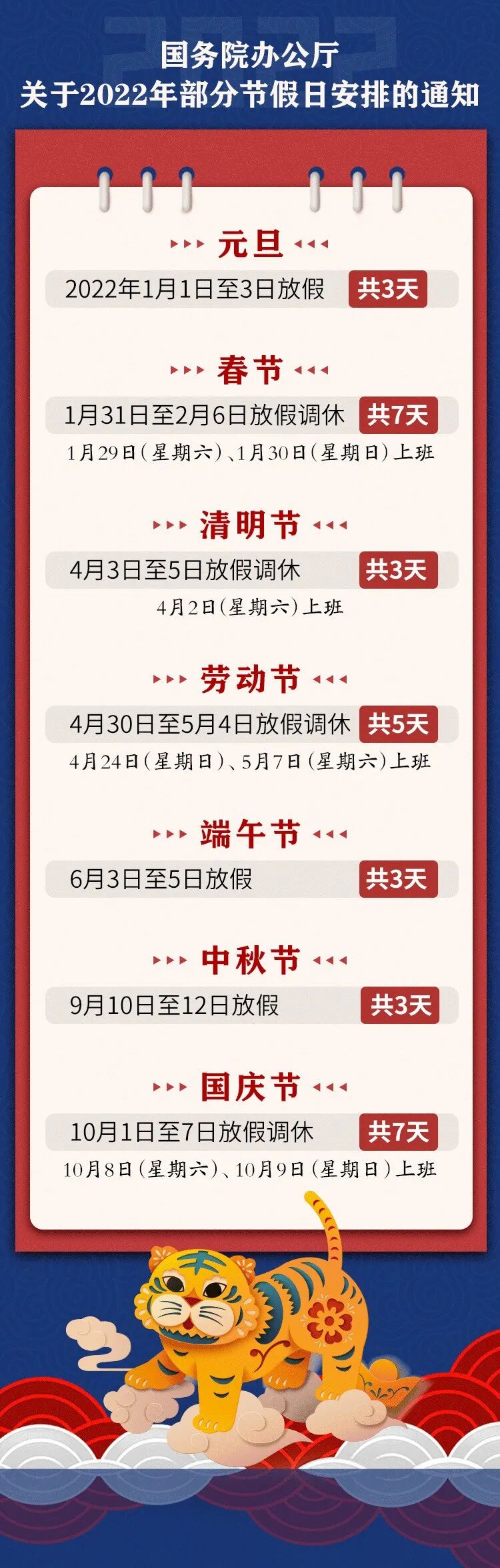 通知明确,根据《国务院办公厅关于2022年部分节假日安排的通知》,明年除正常双休日的节日休假共计31天。其中,春节、清明节、劳动节、国庆节等四个节假日的放假时间与双休日有调休,具体安排如下——