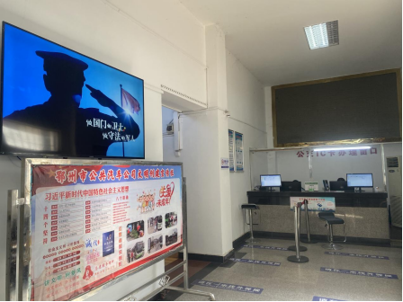 ▲在公交一卡通办卡大厅电视墙播放《宪法宣传周公益宣传片》