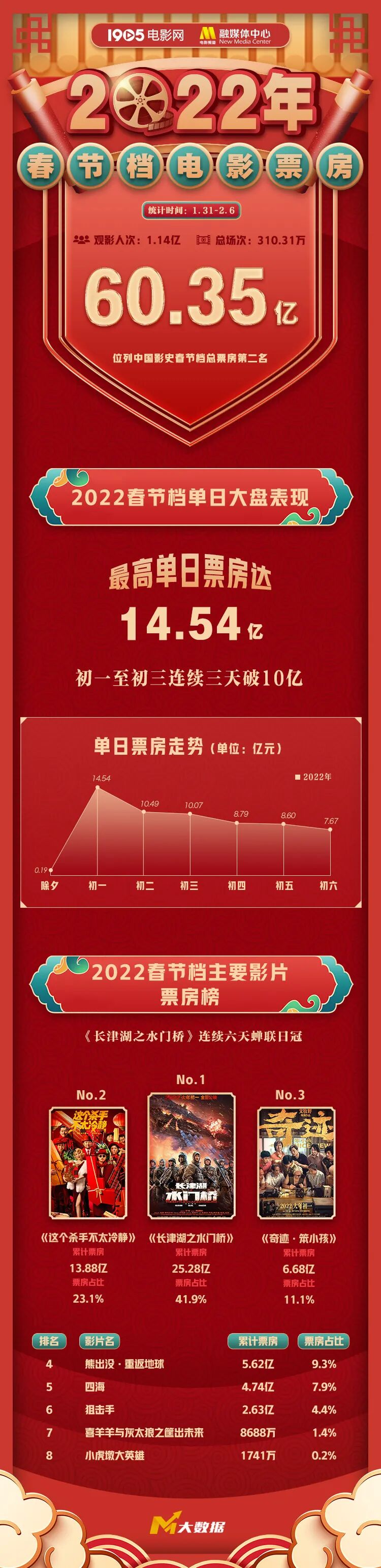 今天小编从国家电影局了解到,春节长假七天,全国电影票房60.35亿元,位居历史同期第二。在疫情防控常态化的背景下,电影市场呈现出欣欣向荣的景象,创下了令人欣喜的佳绩。