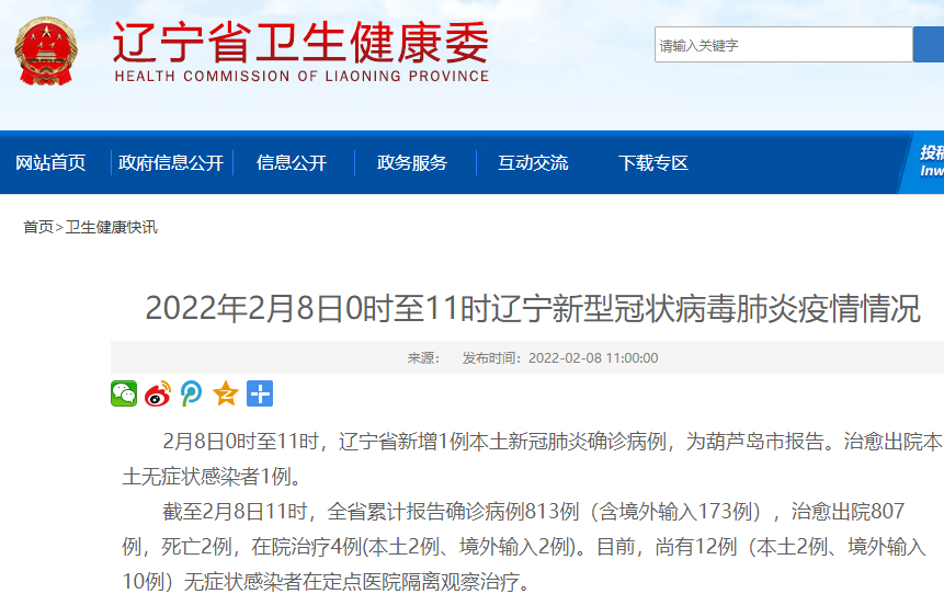 2月8日上午,辽宁省卫生健康委员会官方网站发布消息,2月8日0时至11时,辽宁省新增1例本土新冠肺炎确诊病例,为葫芦岛市报告。