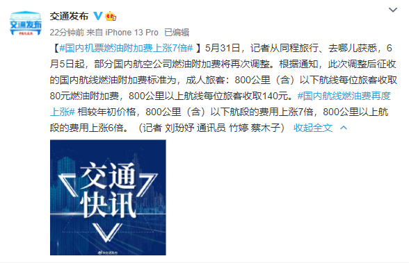 据中国交通报微博消息,5月31日,记者从同程旅行、去哪儿获悉,6月5日起,部分国内航空公司燃油附加费将再次调整。