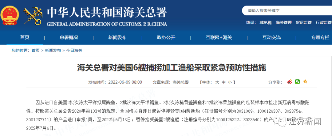 海关总署对美国6艘捕捞加工渔船采取紧急预防性措施