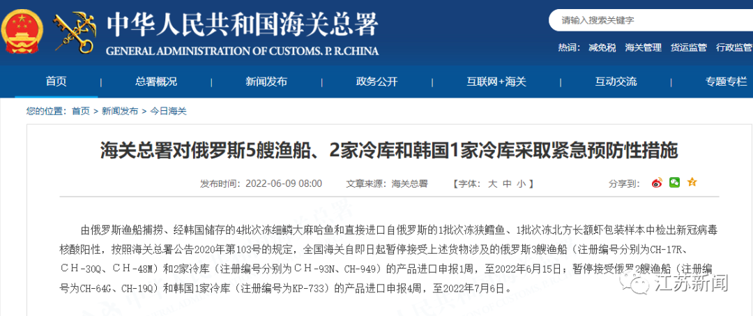 海关总署对俄罗斯5艘渔船、2家冷库和韩国1家冷库采取紧急预防性措施