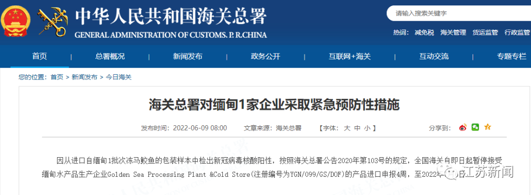 因从进口自缅甸1批次冻马鲛鱼的包装样本中检出新冠病毒核酸阳性,按照海关总署公告2020年第103号的规定,全国海关自即日起暂停接受缅甸水产品生产企业Golden Sea Processing Plant &Cold Store(注册编号为YGN/099/GS/DOF)的产品进口申报4周,至2022年7月6日。
