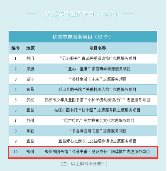 3月17日,由湖北省委宣传部、湖北省文化和旅游厅共同指导,湖北省图书馆主办的第七届长江读书节“十佳评选”获奖名单公布,鄂州市图书馆“传递书香·见证成长”阅读推广志愿服务项目获得十佳“优秀志愿服务项目”。