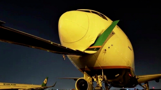 据环球网报道,台湾长荣航勤4月16日晚进行拖机作业,过程中长荣航空一架空客A321飞机机翼翼尖,撞上停放在旁边的长荣航空波音777飞机,翼尖直接插入机头下方。长荣航空已证实此事。