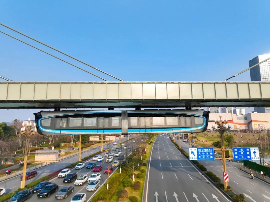 空轨列车采用无人驾驶技术,实现列车在正线无需人工干预的载客运行,配备光纤系统能实时感知和监控轨道及电线缆温度、轨道和周边振动等空轨运行环境,并对异常情况进行预警,充分保障空轨运行顺畅。