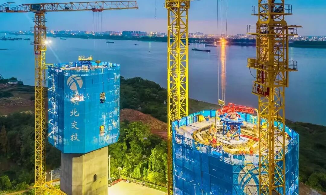 ▲5月11日傍晚,建设者们在燕矶长江大桥项目进行主塔施工。燕矶长江大桥是连接鄂州与黄冈的第二条过江通道,上层为高速公路,下层为城市快速路。