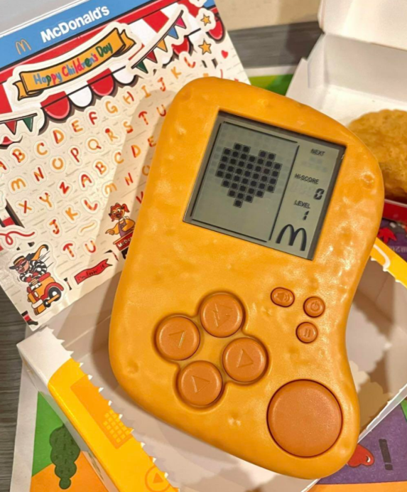 根据两家餐厅官方发公告显示:在肯德基购买69.9元的双人餐即可随机获得联名玩具,分别关联凯蒂猫、玉桂狗、酷洛米、布丁狗等多个IP形象;麦当劳则推出了一款长得和鸡块造型和色系很接近的俄罗斯方块游戏机,到店购买指定套餐+30元,就能获得这个游戏机。
