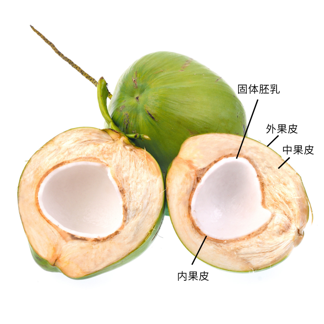 一颗椰子,从植物学层面可以分为外果皮、中果皮、内果皮、液体胚乳和固体胚乳。外果皮是椰子最外层的那一层坚硬的绿色外壳,我们在超市见到的椰子通常已经提前去掉了这一层外壳,在外面的椰子摊就能见到它的真容了。中果皮是椰子那层厚厚的白色纤维,而内果皮就是开椰路上的最大障碍——硬而脆的椰壳,当椰壳和菜刀相遇,拼个两败俱伤也不是没可能。液体胚乳,就是清澈透明的椰子水,而固体胚乳就是肥厚的椰肉了。这一整颗椰子,其实就是椰子树的种子。