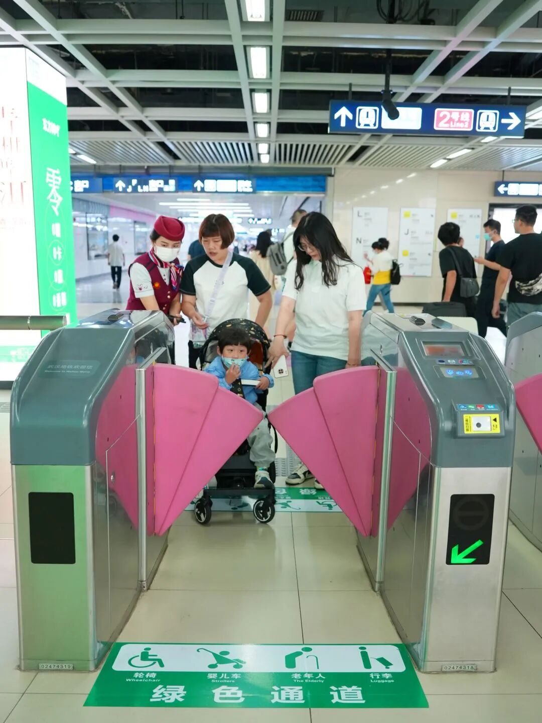 街道口站值班站长胡茜倩帮助带孩子乘客出站。