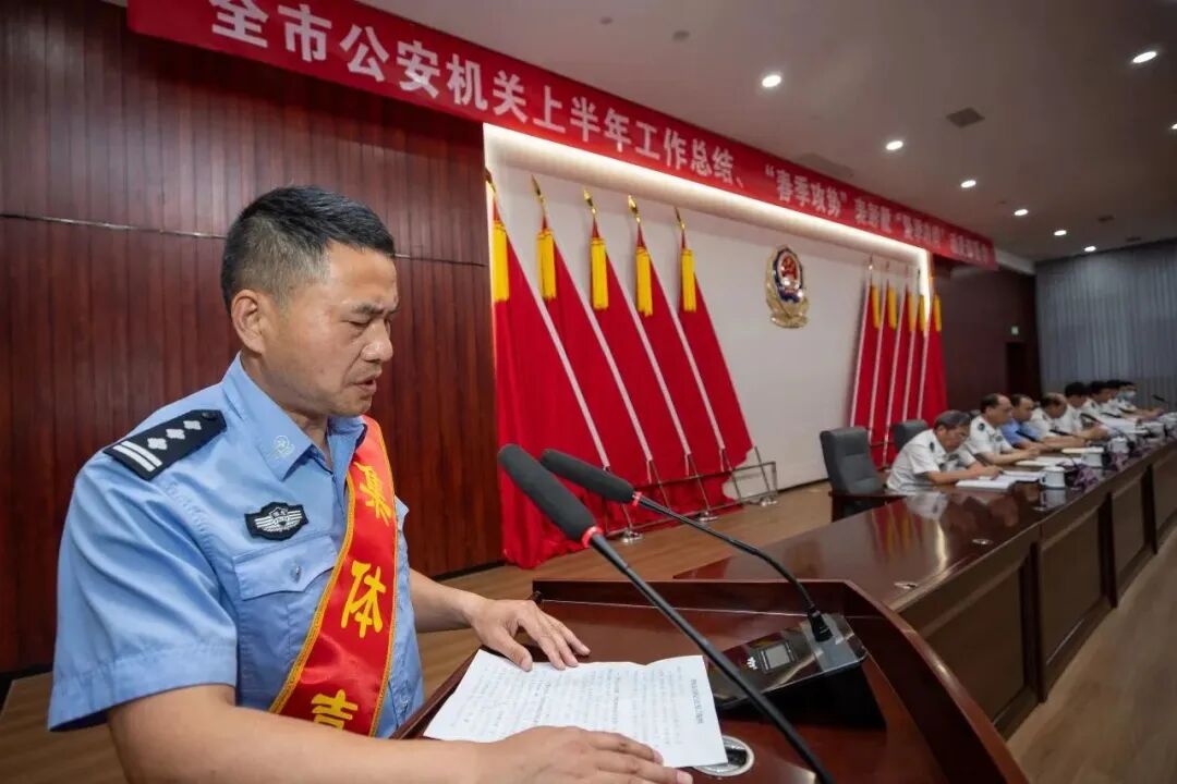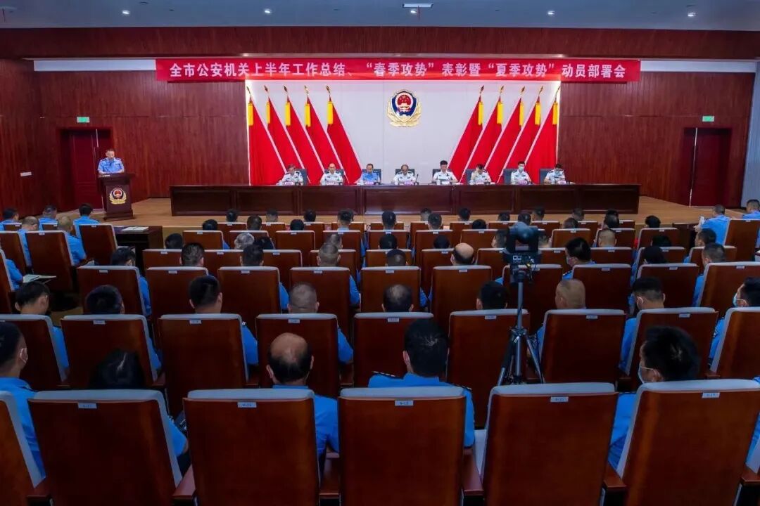 市局党委副书记、常务副局长韩才兵主持会议。在家市局领导班子成员,各分局、局直各单位双主官,各派出所所长、教导员,局直各单位副科级及以上干部,立功受奖先进单位和个人代表参加会议。