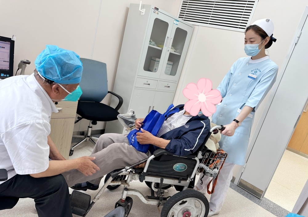 原来,这位耄耋之年的老者是某单位退休人员,当天来医院体检时没有家属陪同。体检中心工作人员考虑到老人年龄大、腿脚不方便,立即开通绿色通道,并安排全程陪检。体检过程中,陪检人员精心照顾、合理安排,协助老人进行各项体检。‘