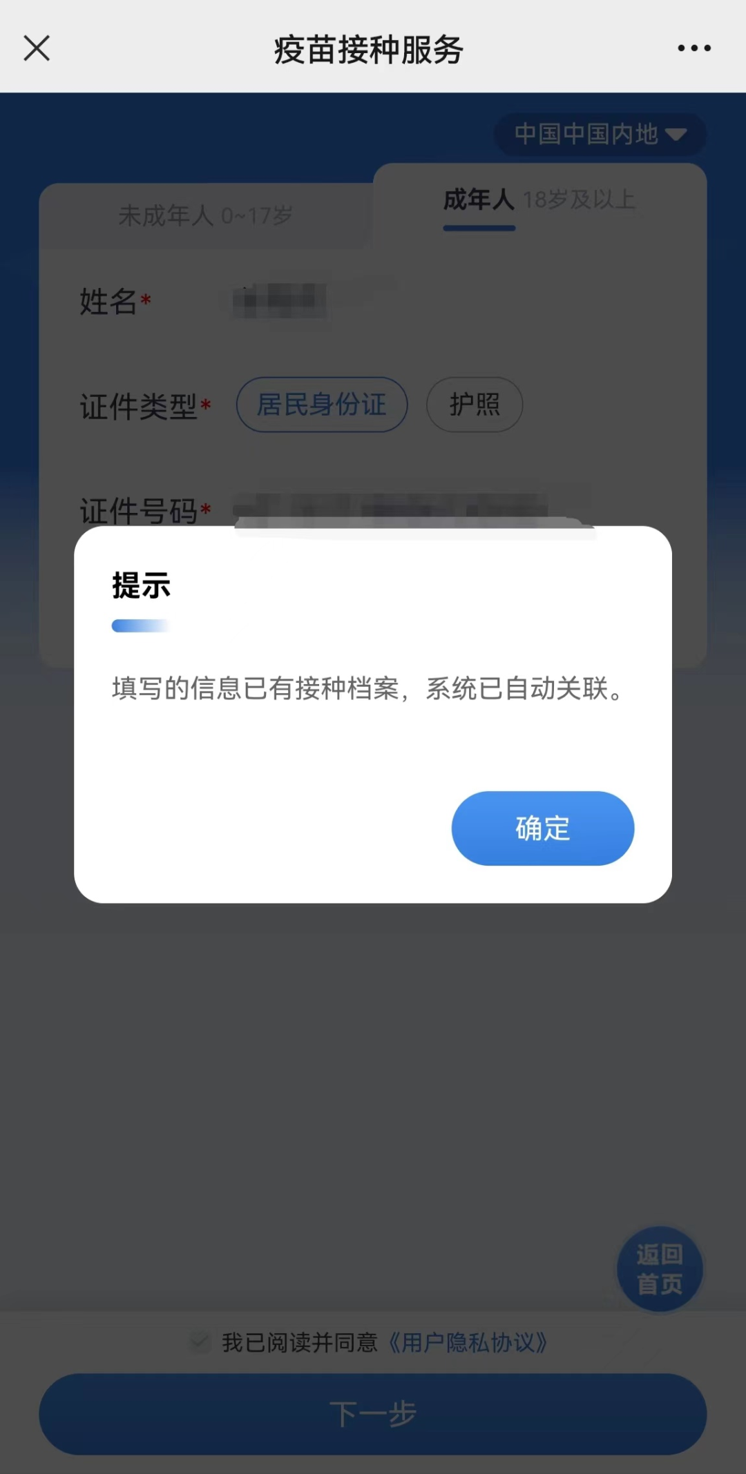 步骤4:点击“下一步”,如输入的家庭成员已有接种档案,系统会自动关联,点击“确定”。
