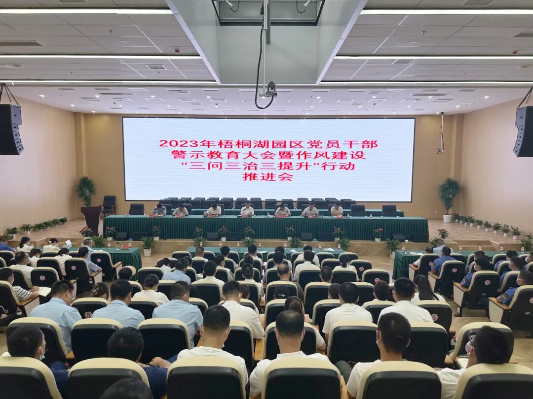 为深入贯彻落实全面从严治党的工作要求,加强梧桐湖园区作风建设和廉政文化建设。7月12日,梧桐湖园区在梁子湖区教育实践培训基地召开园区党员干部警示教育大会暨作风建设“三问三治三提升”行动推进会。区委常委、副区长、园区工委书记陈国璋出席会议并讲廉政党课,园区工委副书记、管委会主任张文选主持会议。