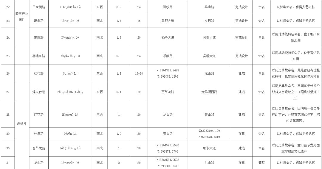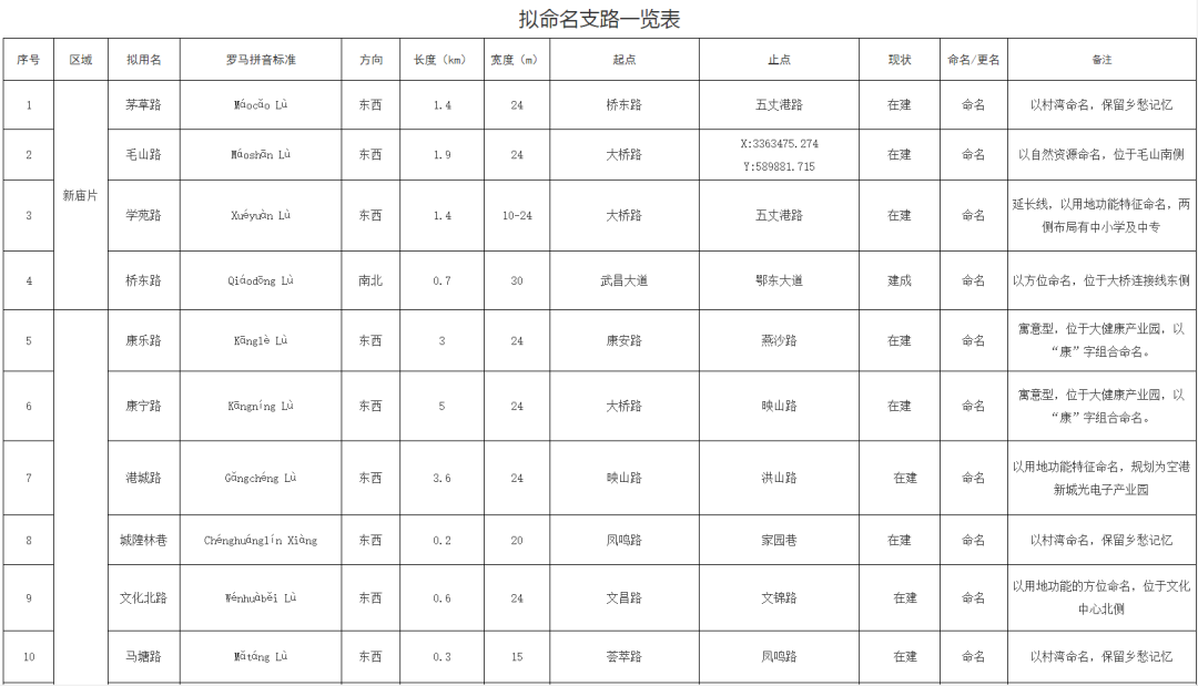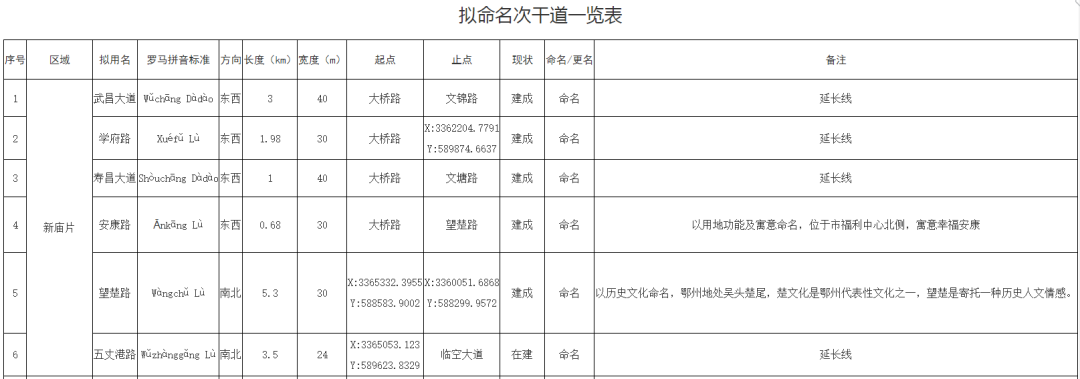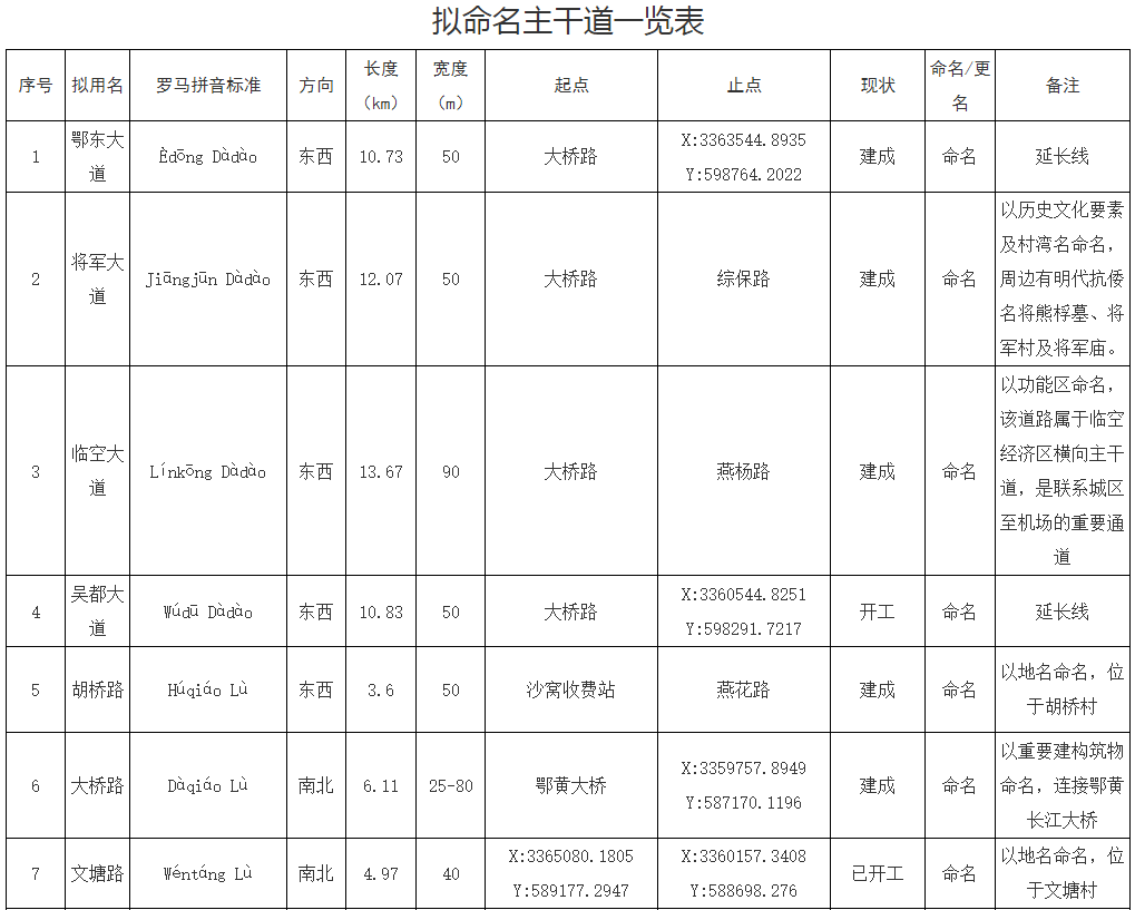 根据地名管理的有关规定,经有关单位申请、专家评审,初步拟定了鄂城区新港路、临空经济区将军大道等16条主干道、34条次干道、33条支路的命名方案。为体现相关地名命名工作的科学合理、公开透明,现将相关命名方案(见附表)公示如下。希望广大群众积极参与,多提宝贵意见和建议。