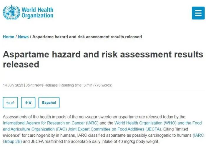 2023年7月14日,世界卫生组织的国际癌症研究机构(IARC)公布将阿斯巴甜列为“可能对人类致癌的物质”。联合国粮农组织/世界卫生组织食品添加剂联合专家委员会(JECFA)公布“维持阿斯巴甜原风险评估结论,按照目前剂量和范围使用,不会对消费者产生健康危害”。阿斯巴甜是国际食品法典委员会(CAC)及中国、美国、欧盟、加拿大、澳大利亚、新西兰、日本、韩国等批准合法使用的食品添加剂。