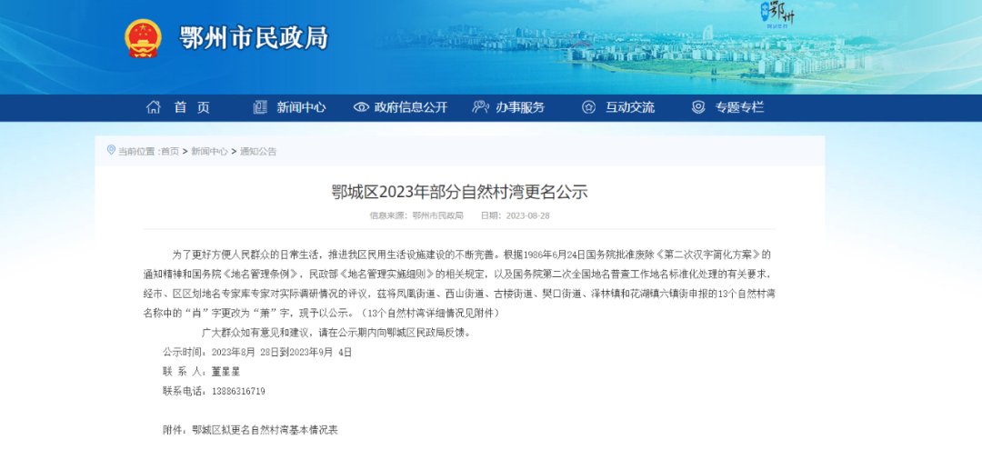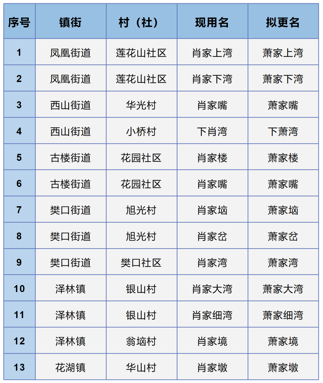 为了更好方便人民群众的日常生活,推进我区民用生活设施建设的不断完善。根据1986年6月24日国务院批准废除《第二次汉字简化方案》的通知精神和国务院《地名管理条例》,民政部《地名管理实施细则》的相关规定,以及国务院第二次全国地名普查工作地名标准化处理的有关要求,经市、区区划地名专家库专家对实际调研情况的评议,兹将凤凰街道、西山街道、古楼街道、樊口街道、泽林镇和花湖镇六镇街申报的13个自然村湾名称中的“肖”字更改为“萧”字,现予以公示。(13个自然村湾详细情况见附件)