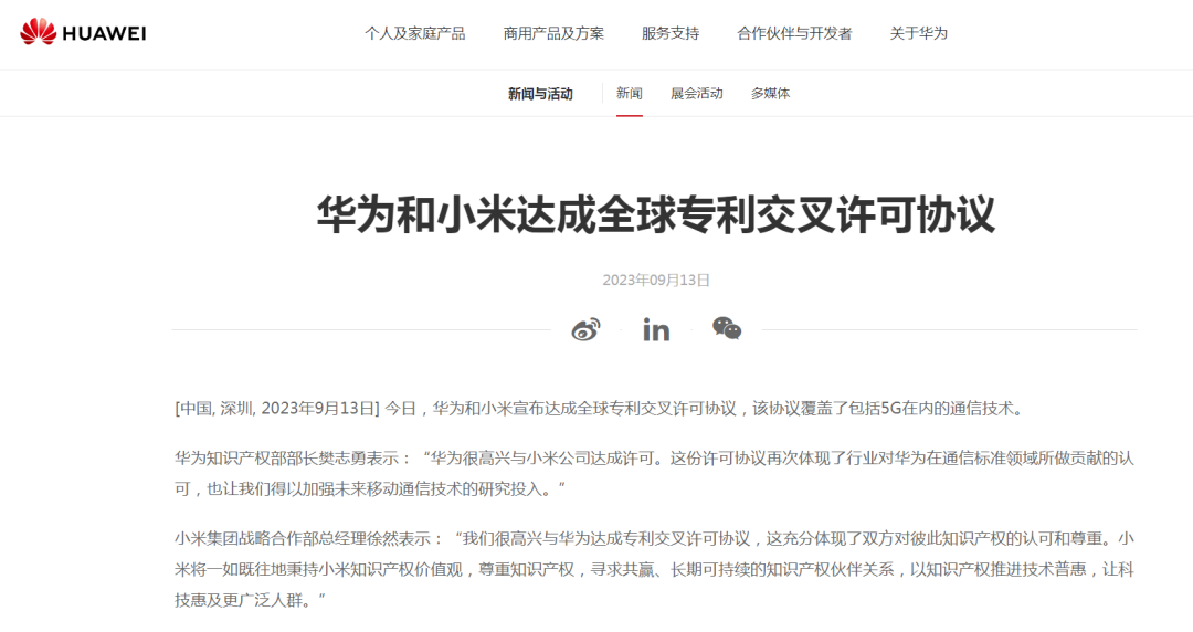 据华为官网消息,9月13日,华为和小米宣布达成全球专利交叉许可协议,该协议覆盖了包括5G在内的通信技术。