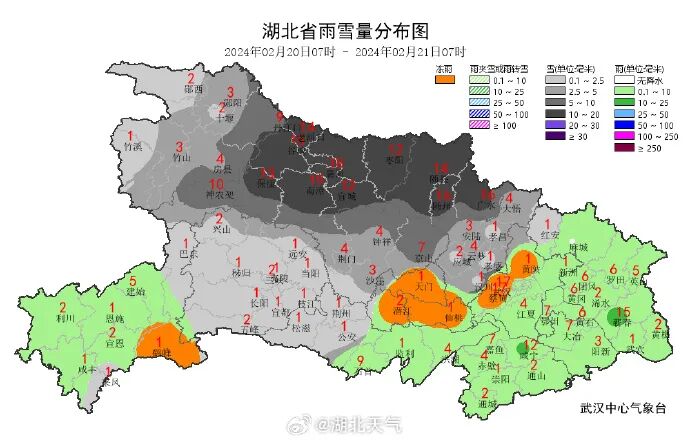 截至今天07时,湖北18县(市、区)出现积雪,积雪深度较大广水4厘米、襄阳南漳3厘米、老河口2厘米、神农架2厘米、荆门2厘米、孝感大悟2厘米;