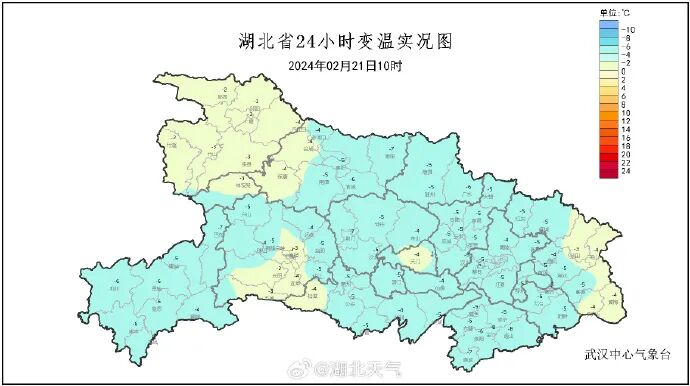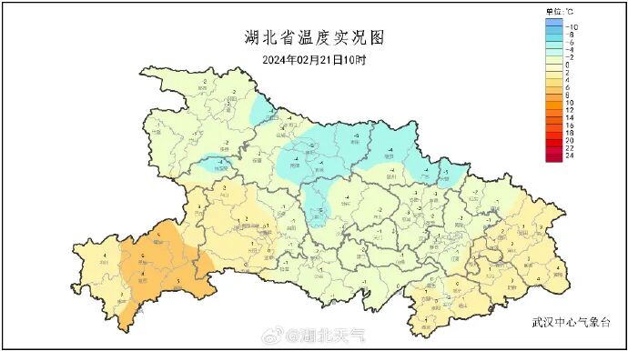 寒潮影响仍在持续,气温呈“俯冲式”下跌,上午10时,除恩施以及鄂东南,其他地区气温纷纷跌入零下,大部地区较昨日下降3~7℃。