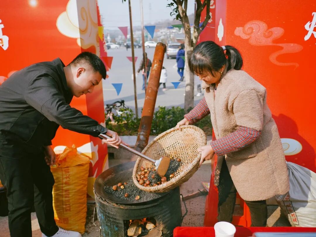 “村晚”余韵未了,乡村风味制作体验区已热火朝天。游客们迫不及待挽起袖子,参与到烫豆丝、打糍粑、炒板栗等传统美食制作中。蒸腾的热气、四溢的香气,是乡村独有的烟火味道。同时,非遗剪纸、转糖人、画年画等民俗趣味游戏也吸引了众多游客参与,大家在品尝美食的同时,也领略到了传统文化的独特魅力。