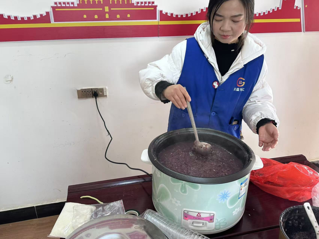 活动伊始,社工们便忙碌起来。他们早早地来到准备场地,将各种食材整齐地摆放好。糯米、红豆、红枣、桂圆、莲子…… 这些食材不仅是制作腊八粥的原料,更是传递温暖与关怀的载体。社工们熟练地将食材清洗干净,按照精确的比例放入锅中,然后耐心地搅拌、炖煮。随着时间的推移,锅中渐渐散发出腊八粥浓郁的香气,也为这个寒冷的冬日增添了几分温暖。