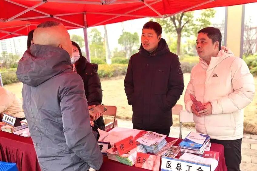 区总工会设立律师服务咨询台,全方位、多渠道为新就业形态劳动者、下岗职工、返乡农民工等就业群体提供政策、法律、心理咨询等服务,工作人员现场详细介绍入会方式、会员福利、医疗互助等政策,发放各类宣传资料400多份,引导他们加强法律意识,在求职就业过程中懂得用法律维护自身合法权益。