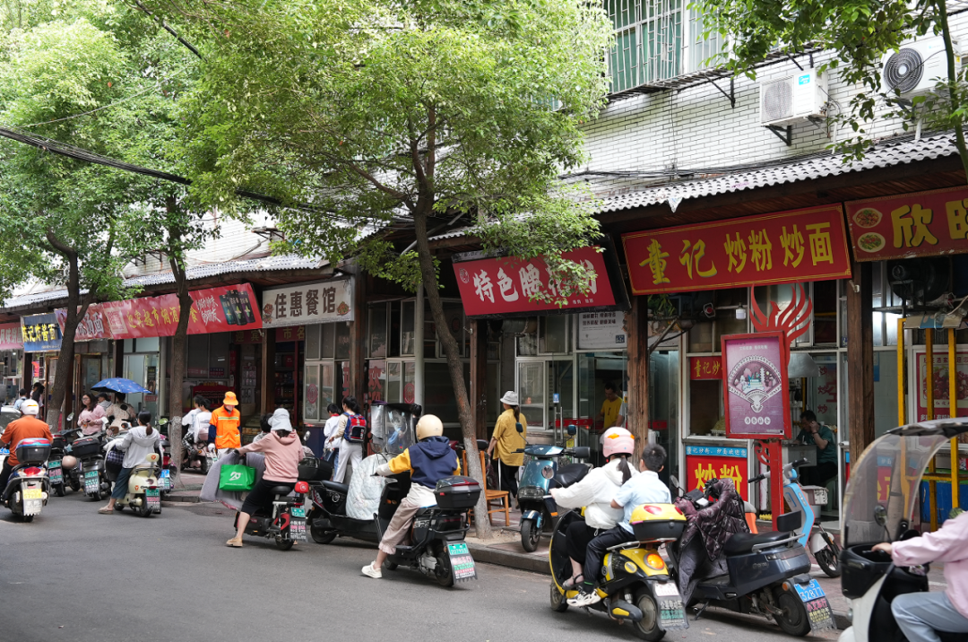 南塔街以明代文星塔得名,展现着丰富的市井画卷。600米长的街道旁,香樟树掩映着各类店铺。清晨的农贸市场人声鼎沸,白天五金店、维修店陆续开张;傍晚,美食聚集的鱼头街成为欢乐的海洋。