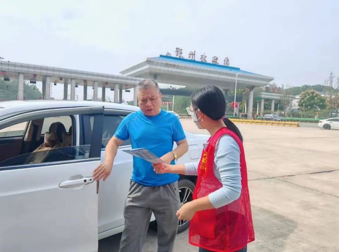 凤凰街道在高速卡口设立志愿服务点,为过往司乘人员提供路线指引、交通信息咨询等贴心服务,并宣传鄂州市的各大旅游景点。