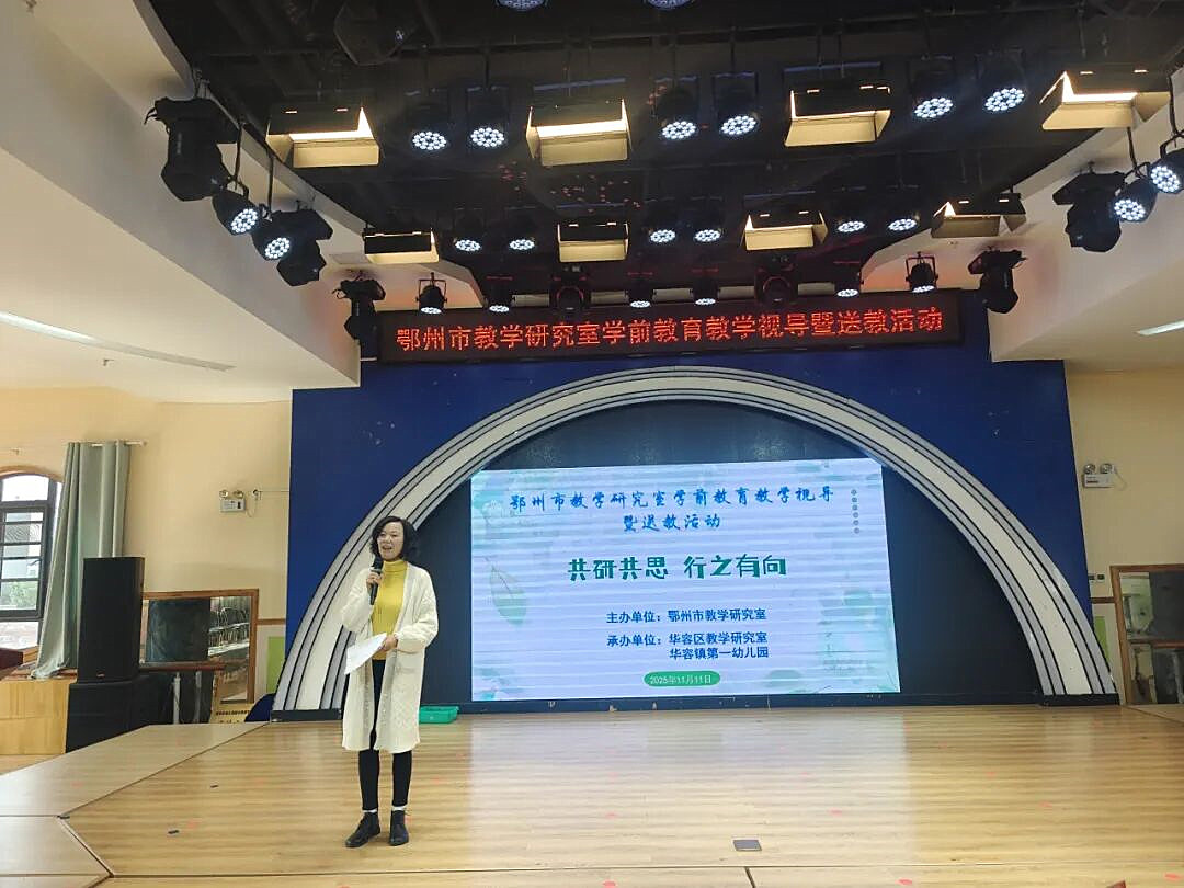 秋韵漫华容,教研暖乡园。11月7日,由市教育局教研室主办的市级教学视导暨送教下乡活动在华容区顺利举行。鄂州市占小玲名师工作室团队受邀参加活动并承担送教指导。本次活动通过示范课展示、沉浸式教研、圆桌座谈等多元形式,为华容区幼儿园50余名园长、骨干教师搭建学习交流与能力提升的优质平台。 活动开始前,市教研室学前教育教研员、市督学刘菊莲及工作室专家团队深入华容一幼,对园所环境进行了细致的巡视指导,提出了兼具专业性与实操性的优化建议。
