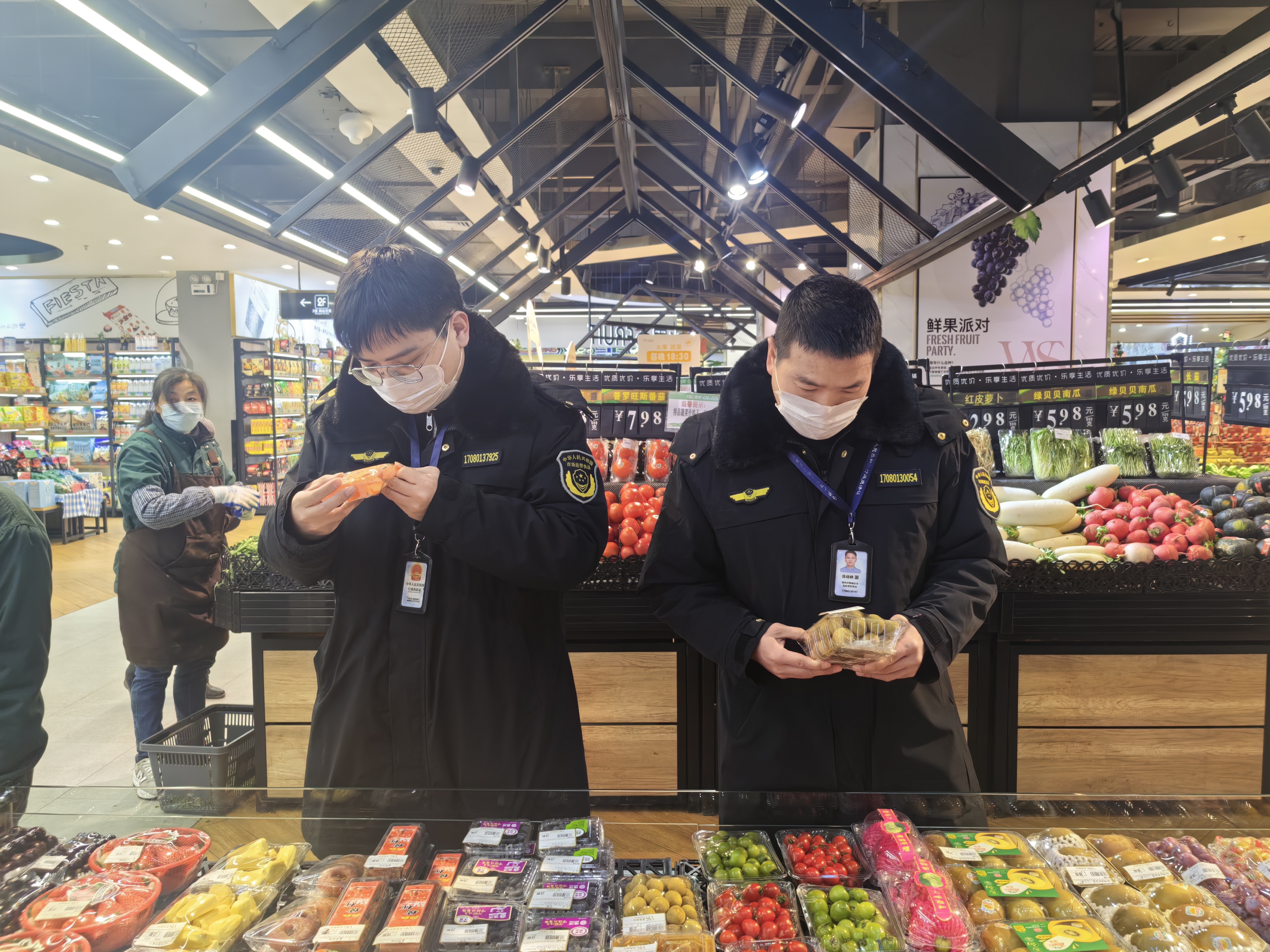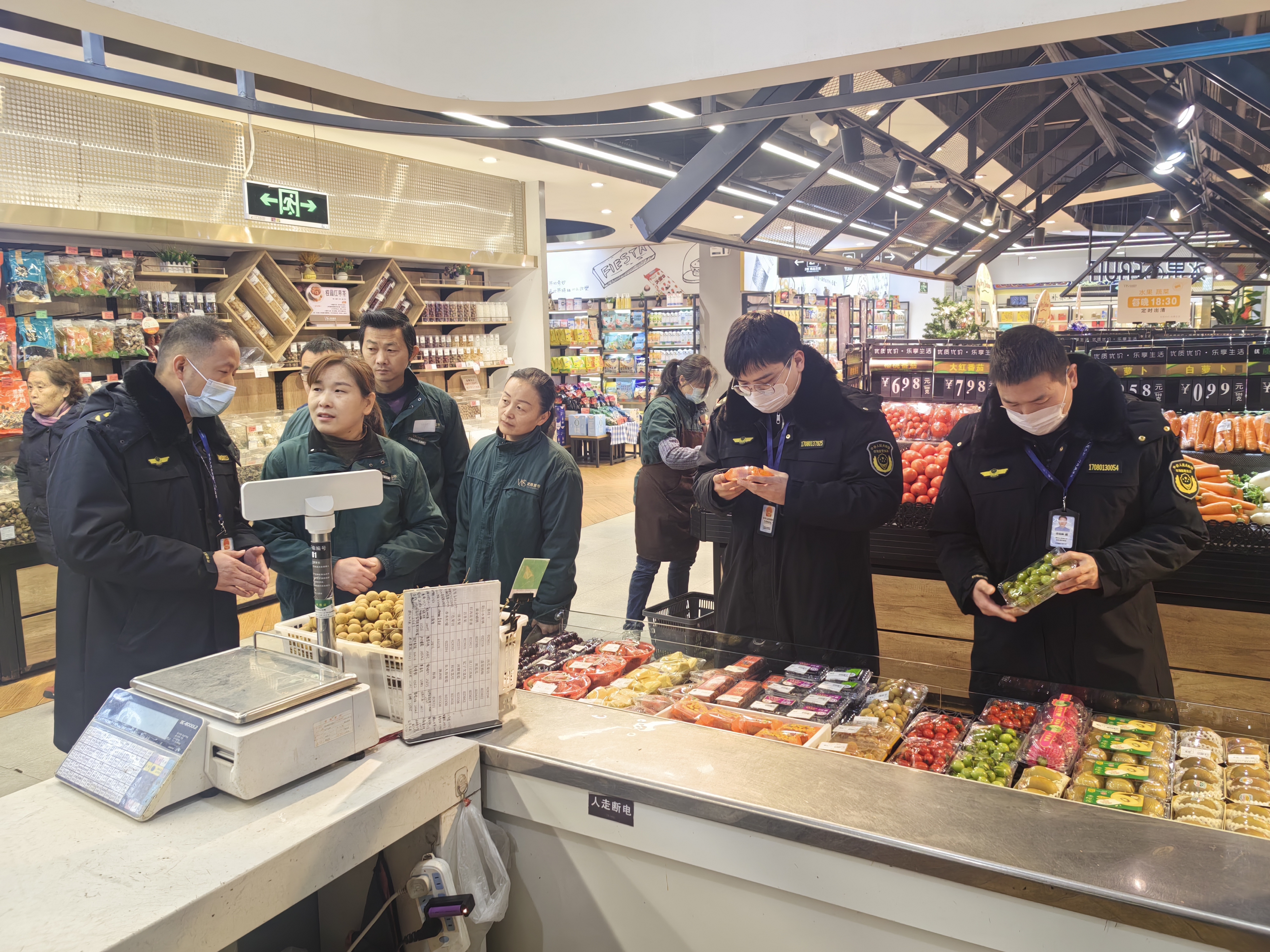 在城区文星路某超市内,市场监管人员仔细核对部分食品的生产日期、临期食品专用标签,并细致核验了蔬菜专柜的当日农残检测公示记录,还随机抽查了鲜肉柜台的动物检疫合格证明、肉品品质检验合格证明及胴体盖章情况。