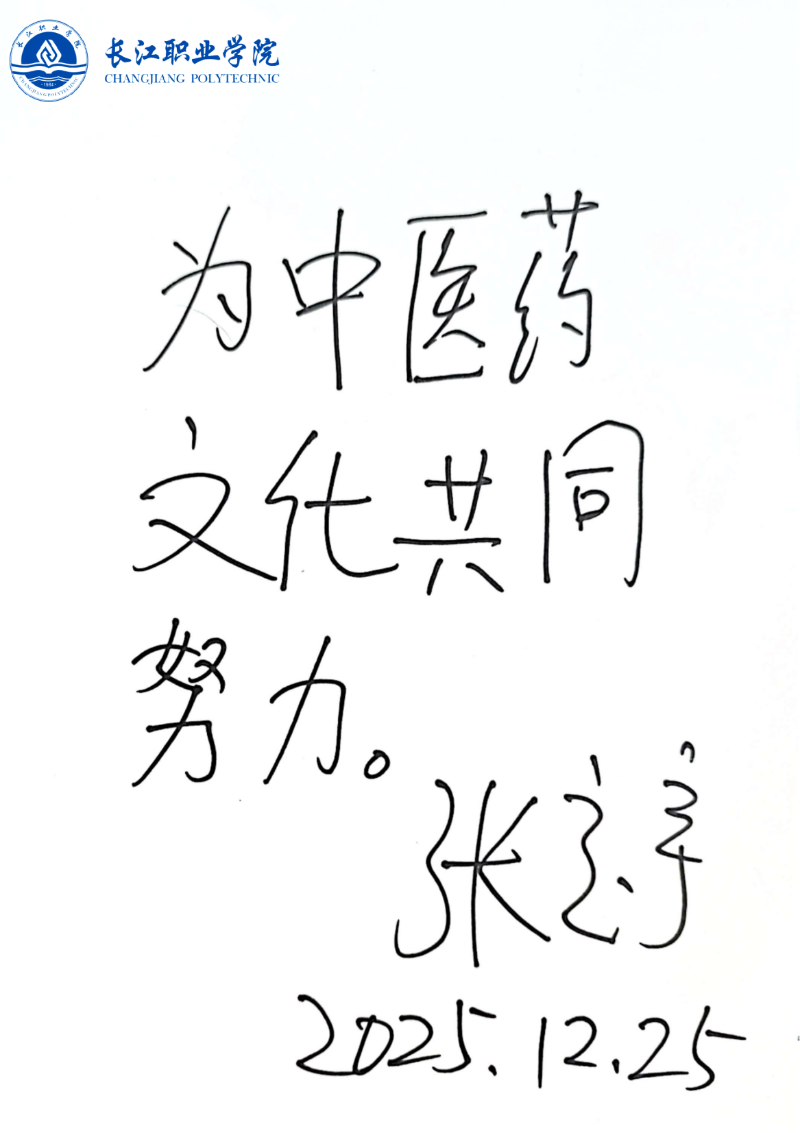 报告会结束后,张定宇参观了学生中医药文创作品。得知他通过中医推拿治疗渐冻症,已能重新骑自行车,且大腿围在5天内增粗2厘米,学生们深受鼓舞,并请他题词勉励。张定宇欣然写下“为中医药文化共同努力”,现场响起热烈掌声。
