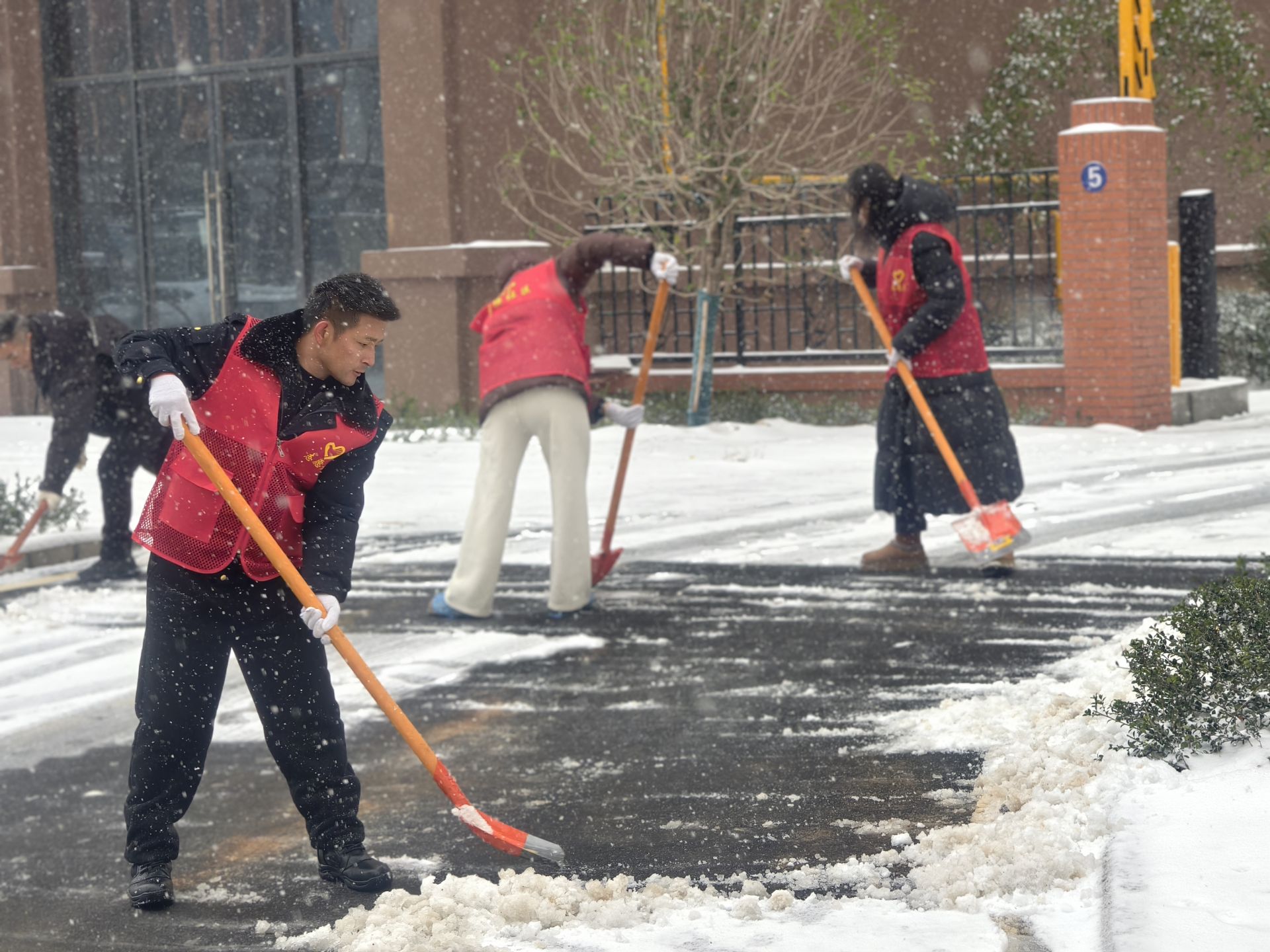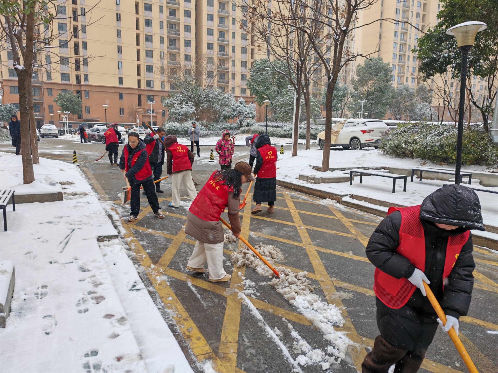 闻雪而动,一大早,沙塘社区就第一时间启动应急预案,一边清点铁锹、融雪剂、防滑垫,一边在微信群、公告栏连发预警,一遍遍叮嘱高龄老人少出门。雪势渐急,他们快速划定主干道、独居老人楼栋口等重点区域,一通通电话联络党员、物业、志愿者,分好片区、定好集合时间,打响清雪攻坚战。