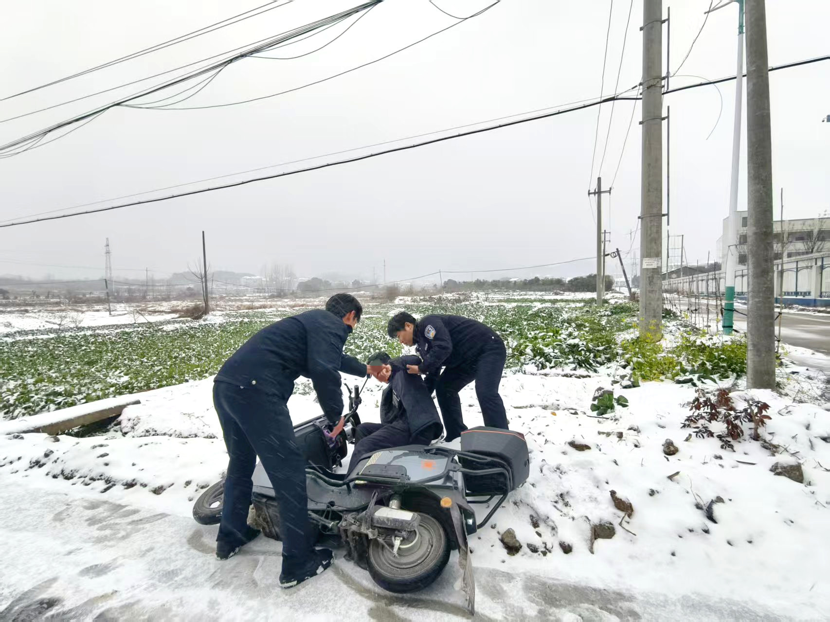 经了解,男子在回家路上,由于下雪车胎打滑,导致连车带人翻到沟中。民警确认车子可以正常行驶后,叮嘱男子骑车一定要注意安全。男子对民警的及时救助连声感谢,并表示一定会把安全放在第一位。